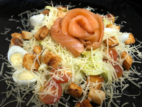 сочетание свежих листьев салата Айсберг, копчёного лосося, хрустящих пшеничных гренок с сочными помидорками черри и перепелиным яйцом, под фирменным соусом "Цезарь" от шефа и сыром Пармезан