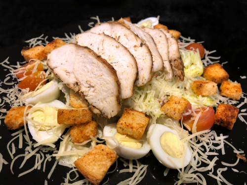 сочетание свежих листьев салата Айсберг, курочки с прянными травами, хрустящих пшеничных гренок с сочными помидорками черри, перепелинным яйцом, под фирменным соусом Цезарь от шефа и сыром Пармезан