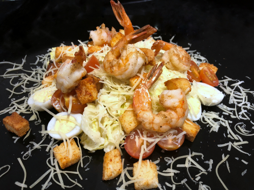 сочетание свежих листьев салата Айсберг, нежных обжаренных креветок, хрустящих пшеничных гренок с сочными помидорками черри и перепелинным яйцом, под фирменным соусом "Цезарь" от шефа и сыром Пармезан