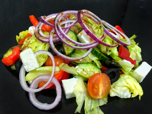 классический салат из свежих сочных овощей. Листья салата Айсберг, помидорки черри, огуречик, болгарский перец, маслины, красный лук, сыр Фета под фирменной заправкой от шефа.