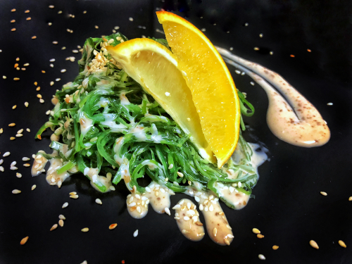 традиционный японский салат под лёгким ореховым соусом с освежающими дольками лимона и апельсина