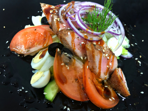 лёгкий диетический салат с обжаренным тунцом, свежим томатом, огуречком, перепелиным яйцом, украшенный красным луком и маслинами под фирменной заправкой от шефа и бальзамическим соусом