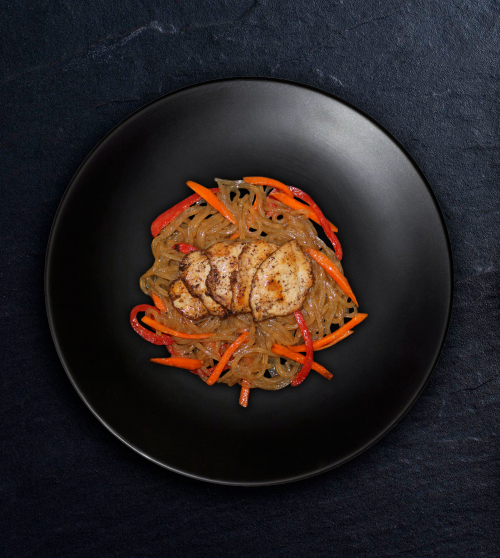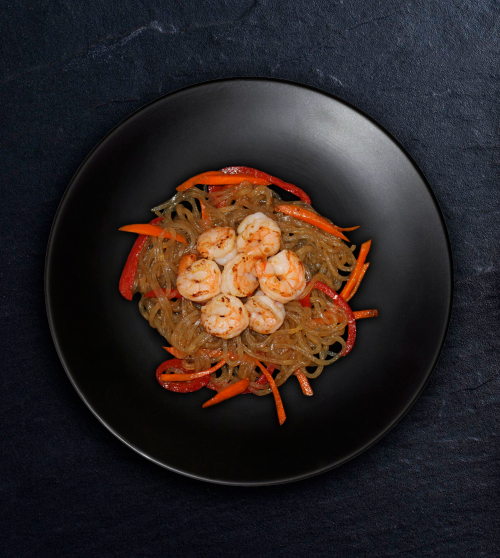 Лапша рисовая под устричным соусом, морковь, перец болгарский, креветки жареные с чесночным фрешем.