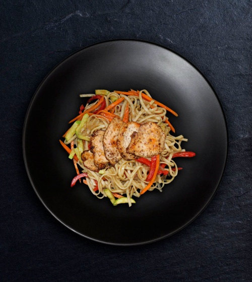 Лапша удон под фирменным соусом, курица, морковь, лук репчатый, перец болгарский, цукини, посыпается зеленым луком и белым кунжутом (на фото нет)