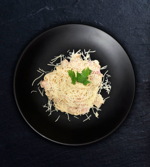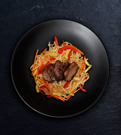 Лапша удон под фирменным соусом, говядина, морковь, лук репчатый, перец болгарский, цукини, посыпается зеленым луком и белым кунжутом (на фото нет)
