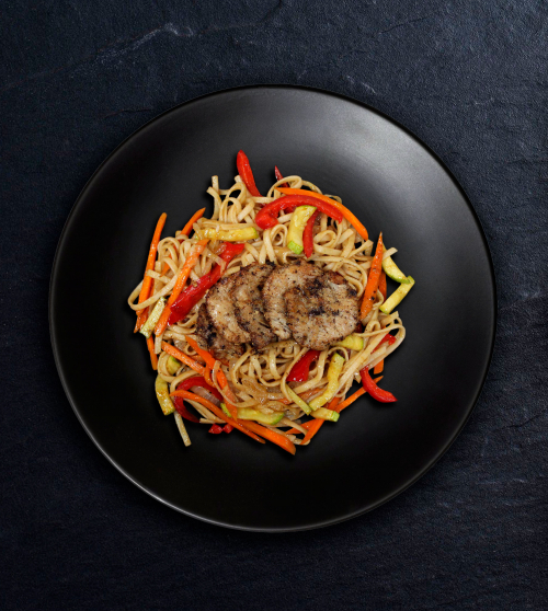 Лапша удон под фирменным соусом, свинина, морковь, лук репчатый, перец болгарский, цукини, посыпается зеленым луком и белым кунжутом (на фото нет)