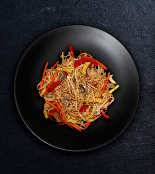Лапша удон под фирменным соусом, морковь, лук репчатый, перец болгарский, шампиньоны,цукини, посыпается зеленым луком и белым кунжутом (на фото нет)