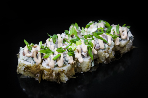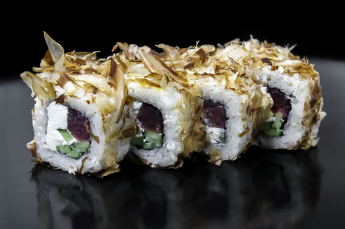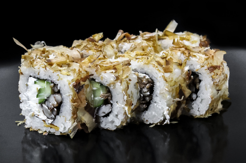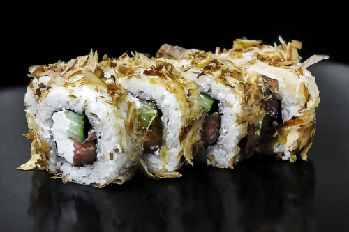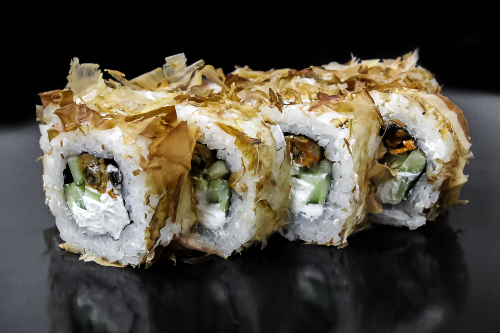 ролл со сливочным сыром, свежим огурцом и мидиями, обжаренными в соусе терияки, в стружке тунца