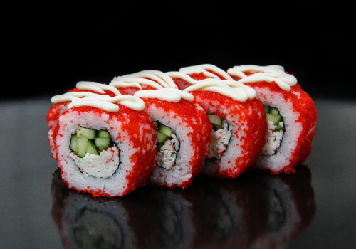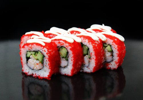 ролл с мясом снежного краба и свежим огурцом, в икре "Тобико" , под японским майонезом