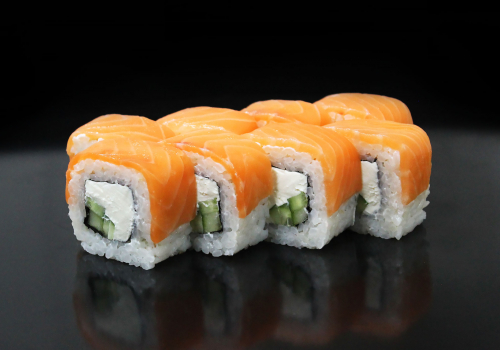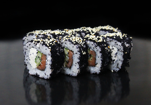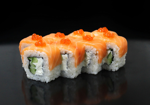 ролл со сливочным сыром, копчёным лососем и свежим огурцом, под икрой "Тобико" и кунжутом