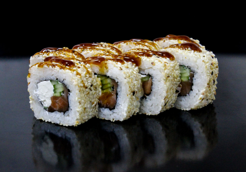 ролл со сливочным сыром, лососем и свежим огурцом, в жареном кунжуте, под соусом "Унаги"