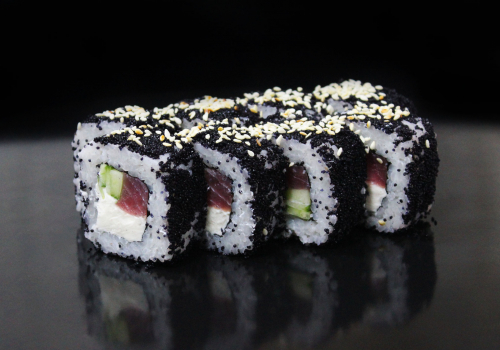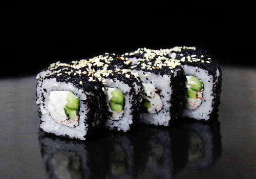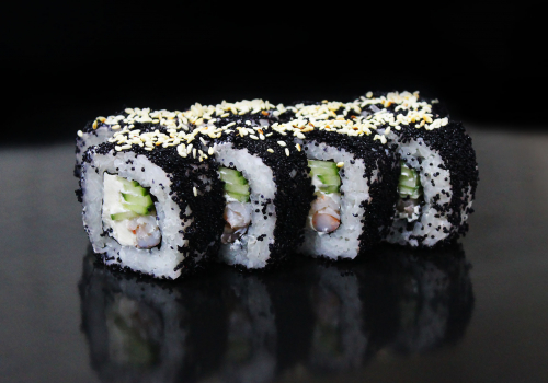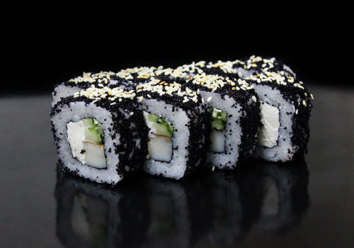 ролл со сливочным сыром, копчёным кальмаром и свежим огурцом, под икрой "Тобико" и кунжутом