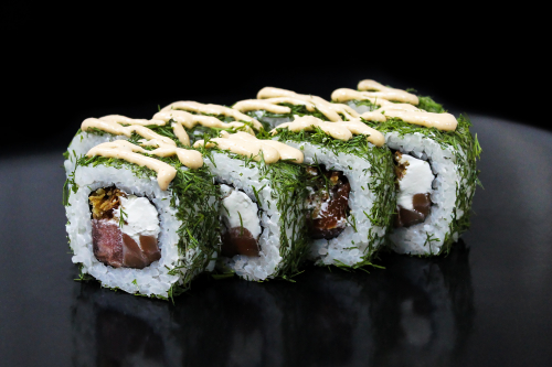 Ролл со сливочным сыром, снежным крабом ,пекинской капустой ,жаренным угрем , нежным авокадо ,тобико ,спайси соусом ,под соусом унаги и кунжутом5 шт. в порции