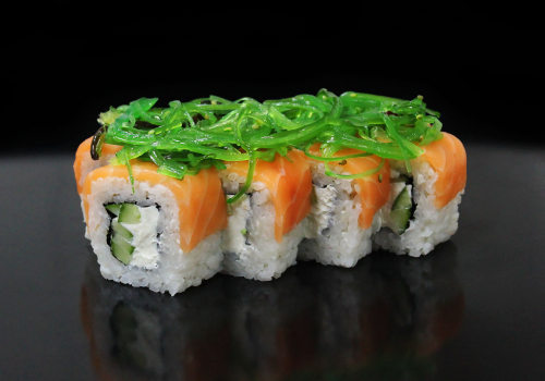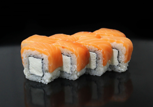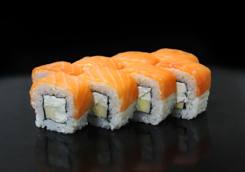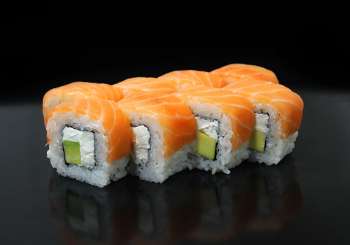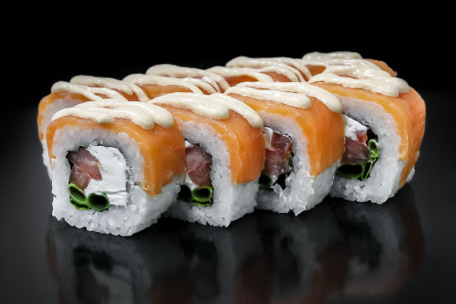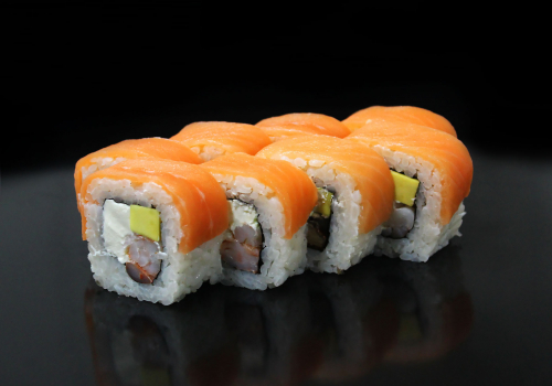 ролл со сливочным сыром, лососем, авокадо и креветкой, обжаренной с чесноком и чёрным перцем
