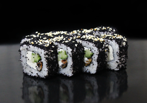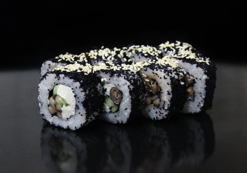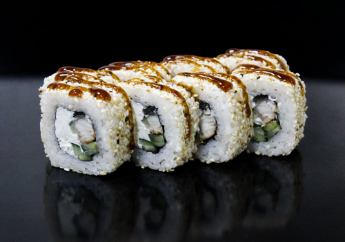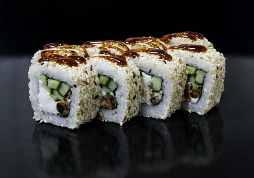 ролл со сливочным сыром, свежим огурцом и мидиями, обжаренными в соусе "Терияки" в жареном кунжуте, под соусом "Унаги"