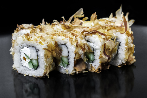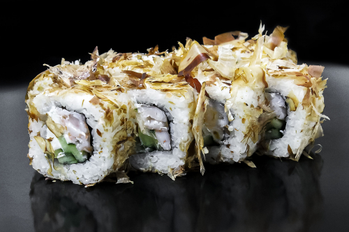 ролл со сливочным сыром, свежим огурцом и креветкой, обжаренной с чесноком и черным перцем, в стружке тунца
