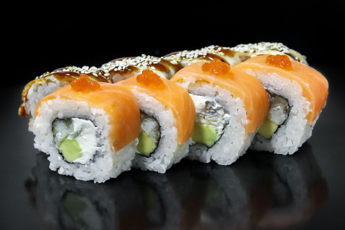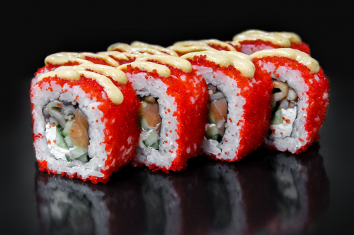 ролл со сливочным сыром, копчёным угрём, авокадо и креветкой, обжаренной с чесноком и чёрным перцем, в икре "Тобико", под японским майонезом