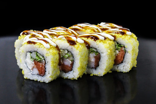 ролл со сливочным сыром и нежным крабом, свежим лососем, авокадо японским майонезом в икре тобико под соусом Унаги и кунжутом