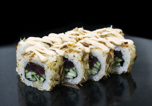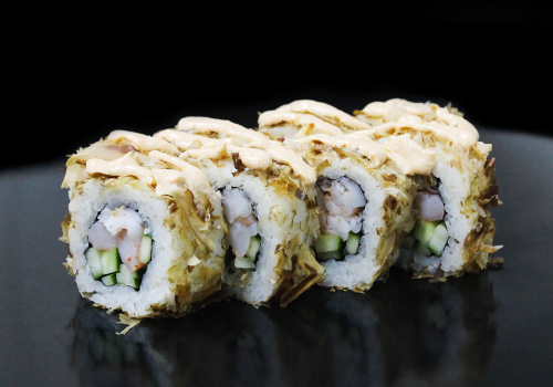ролл со свежим огурцом и креветкой, обжаренной с чесноком и черным перцем, в стружке тунца, под острым соусом "Спайси"