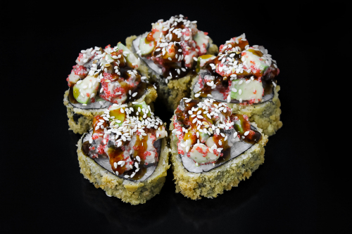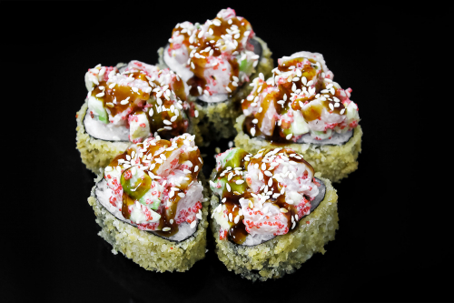 Ролл со сливочным сыром, снежным крабом ,пекинской капустой ,обжаренной креветкой , нежным авокадо ,тобико ,японским майонезом ,под соусом унаги и кунжутом5 шт. в порции