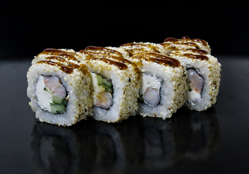 ролл со сливочным сыром, свежим огурцом и креветкой, обжаренной с чесноком и чёрным перцем, в жареном кунжуте, под соусом "Унаги"