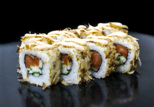 ролл со сливочным сыром, копчёным лососем и свежим огурцом, в жареном кунжуте, под соусом "Унаги"