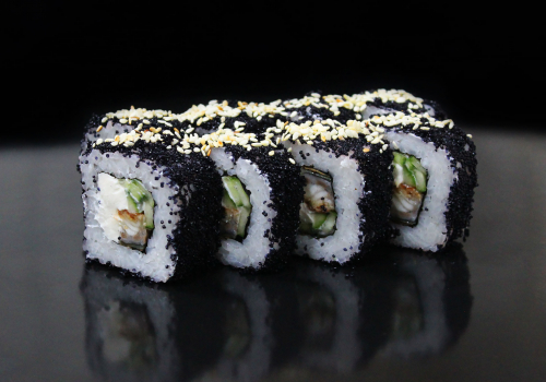 ролл с с копчёным угрём и свежим огурцом, в икре "Тобико", под японским майонезом