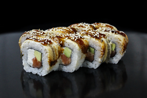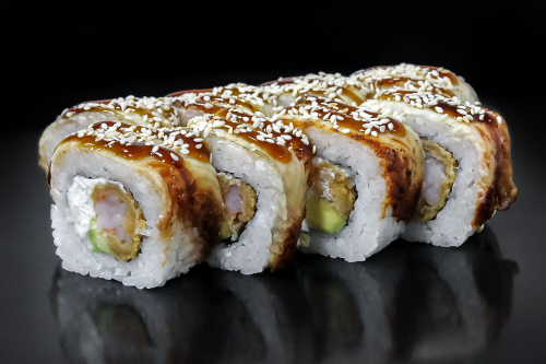 ролл со сливочным сыром, лососем, авокадо и опалённым копчёным угрём, под соусом "Унаги" и кунжутом