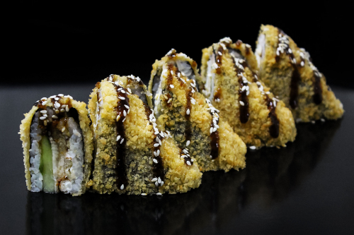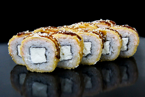 жареный ролл со сливочным сыром, лососем, обжаренным в соусе "Терияки", икрой тобико и свежим огурцом, под соусом "Унаги" и кунжутом