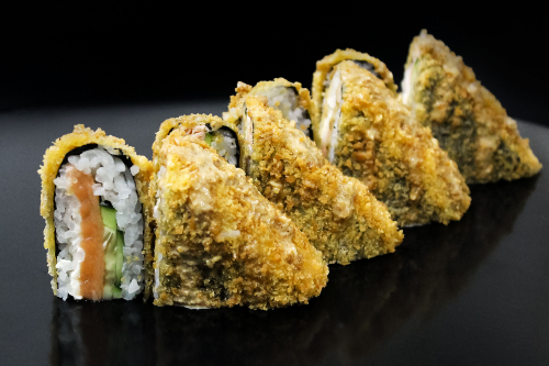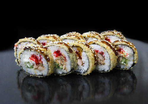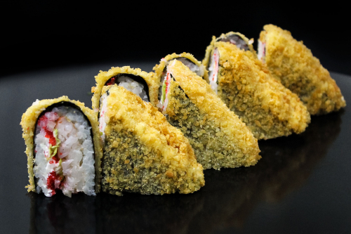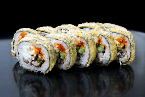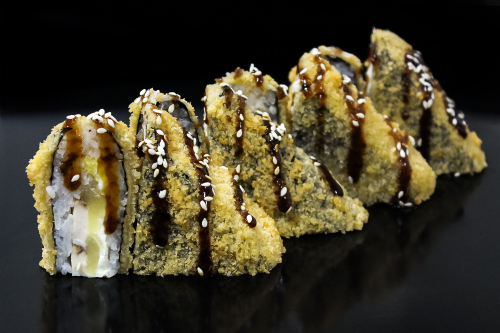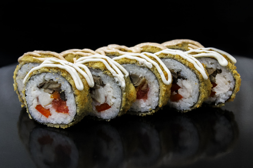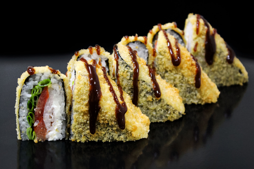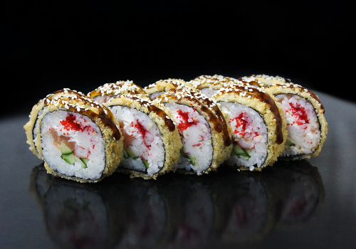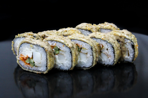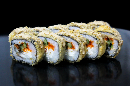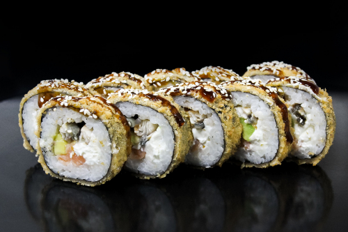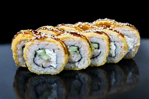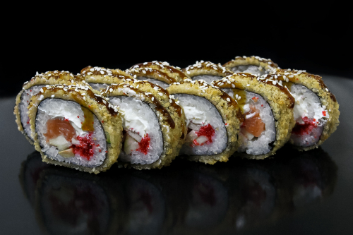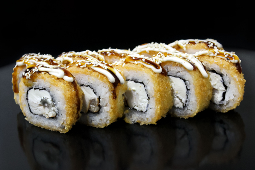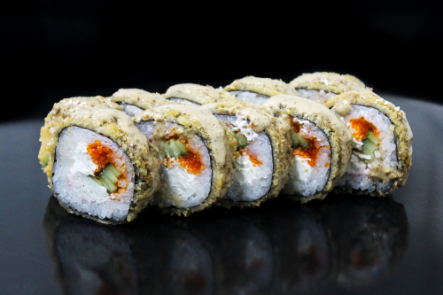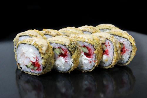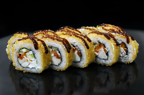 жареный ролл со сливочным сыром, икрой "Тобико", мясом снежного краба и свежим огурцом, под ореховым соусом (на фото нет)