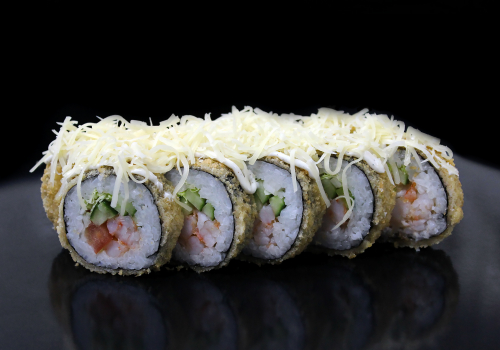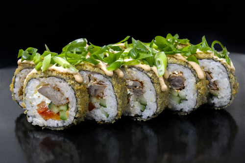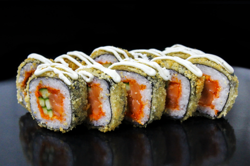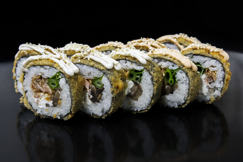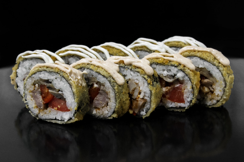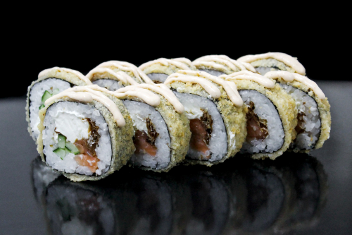 жареный ролл со сливочным сыром , жареным лососем, обжареном в соусе Терияки, зелёным луком, шампиньонами, обжаренными в соевом соусе и чесноком, под японским майонезом, острым соусом Спайси (пополам) и жареным кунжутом
