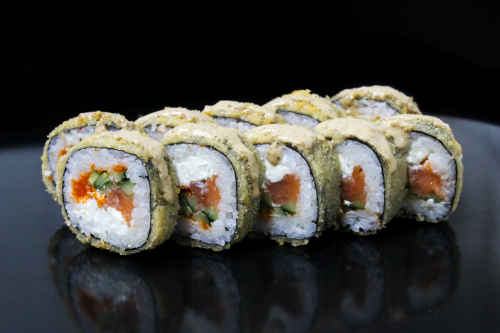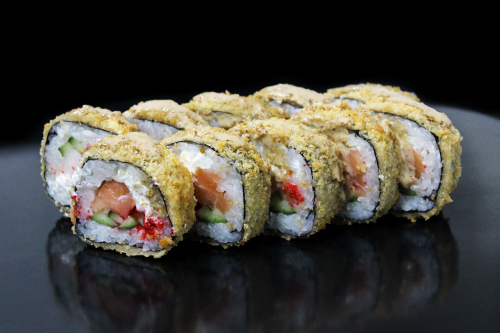 жареный ролл со сливочным сыром, икрой "Тобико", лососем и свежим огурцом, под ореховым соусом (на фото нет)
