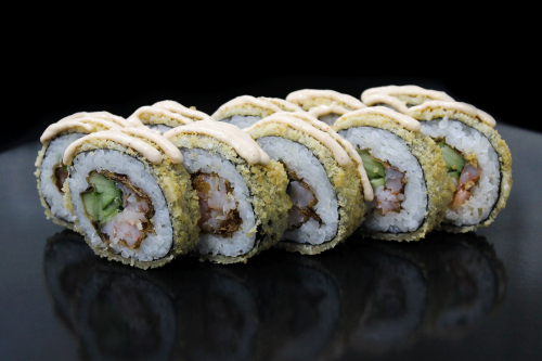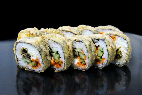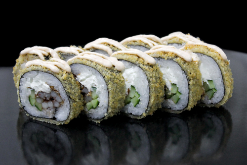 жареный ролл со сливочным сыром, икрой "Тобико", свежим огурцом и креветкой, обжаренной с чесноком и чёрным перцем, под ореховым соусом (на фото нет)