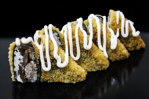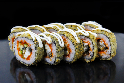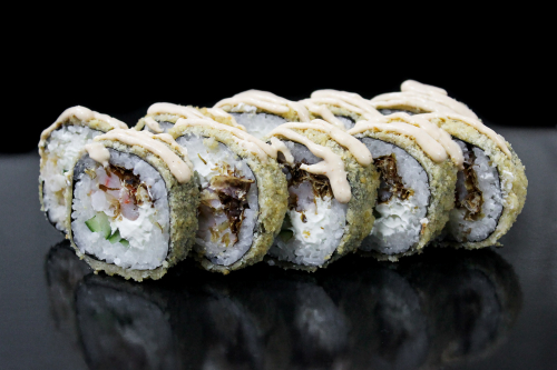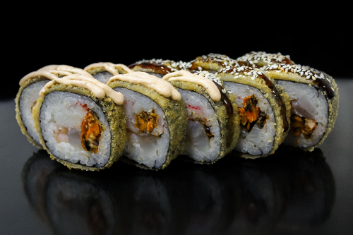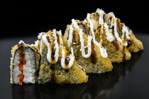 жареный ролл с креветкой, обжаренной с чесноком и черным перцем, мидиями, обжаренными в соусе "Терияки", морским окунем и мясом снежного краба, под соусом "Спайси",соусом "Унаги" и кунжутом ( на пополам)