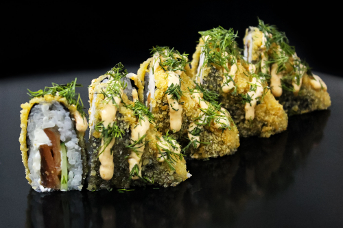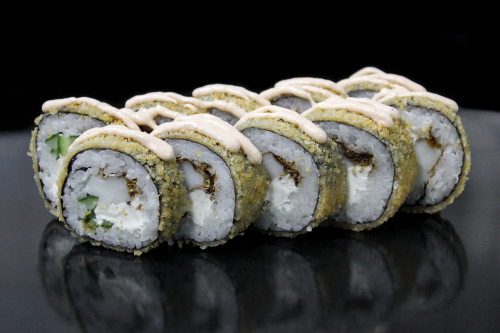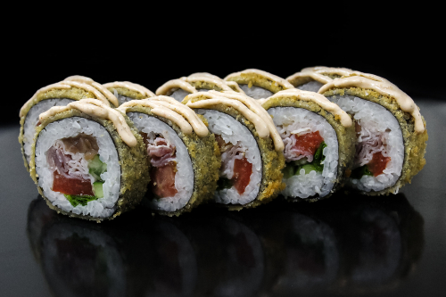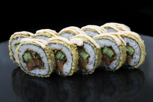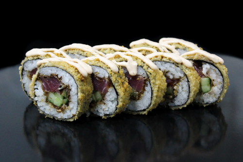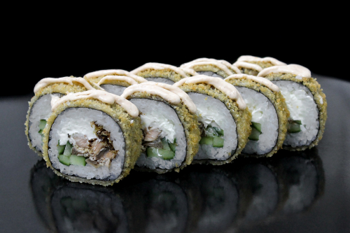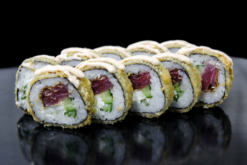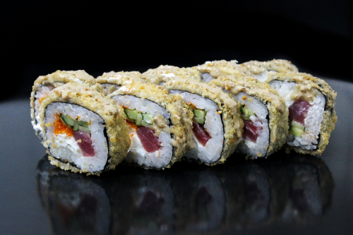 жареный ролл со сливочным сыром, икрой "Тобико", тунцом и свежим огурцом, под ореховым соусом (на фото нет)