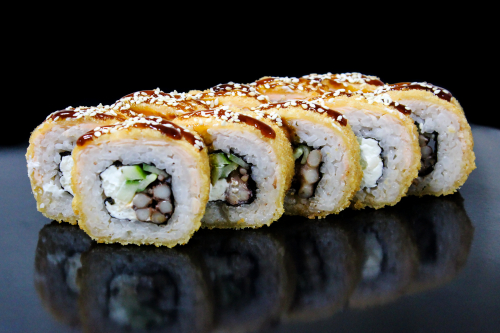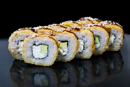 жареный ролл со сливочным сыром, лососем, копчёным угрём и авокадо под соусом унаги и жареным кунжутом