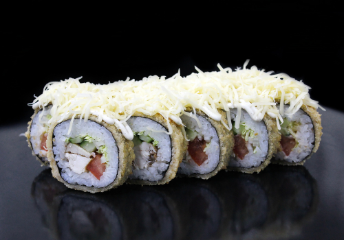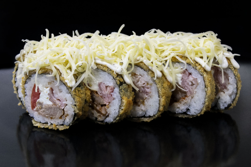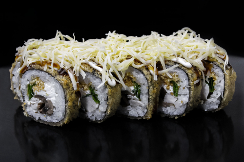 жареный ролл со сливочным сыром, копчённой курочкой, жареными шампиньонами, солёным арахисом, зелёным луком под японским майонезом соусом Терияки и сыром пармезан