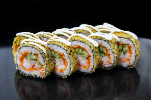 жареный ролл с креветкой, обжаренной с чесноком и чёрным перцем, икрой "Тобико" и свежим огурцом, под японским майонезом