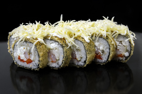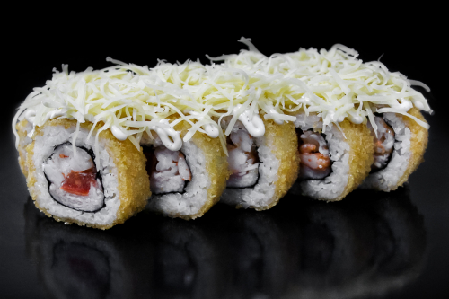 жареный ролл со сливочным сыром,жареной треской,жареной креветкой,сочным болгарским перцем под японским майонезом и сыром пармезан