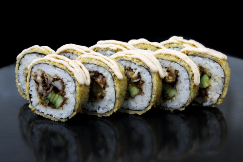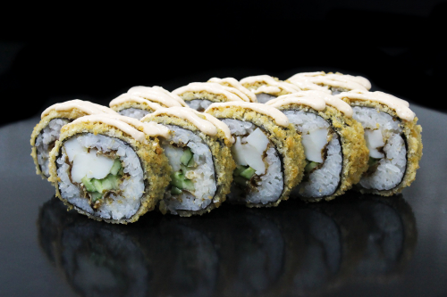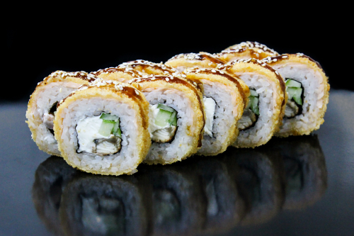жареный ролл с копчёным угрём, икрой "Тобико" и свежим огурцом, под японским майонезом