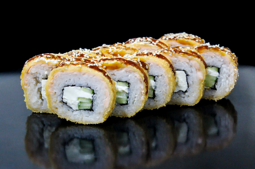 жареный ролл со сливочным сыром, лососем ,копчёным угрём и свежим огурцом, под соусом "Унаги" и кунжутом