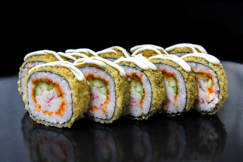 жареный ролл с мясом снежного краба , икрой "Тобико" и свежим огурцом, под японским майонезом