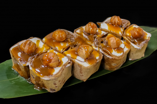 десертный ролл с нежной сливочной начинкой, шоколадной пастой, лесным орехом и бананом, в шоколадном блинчике под карамельным топингом