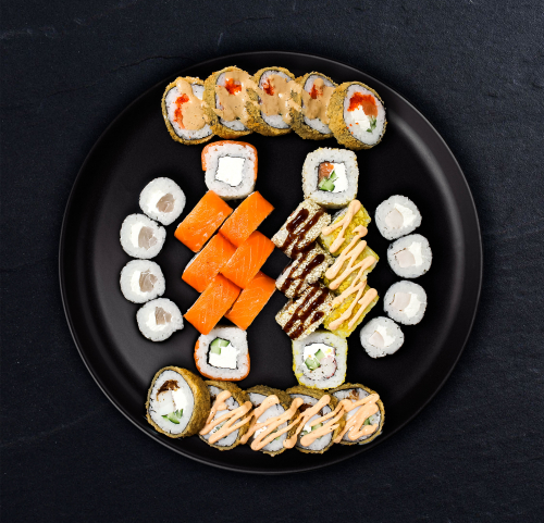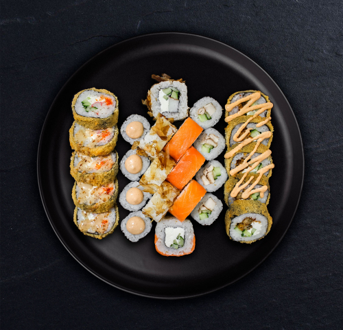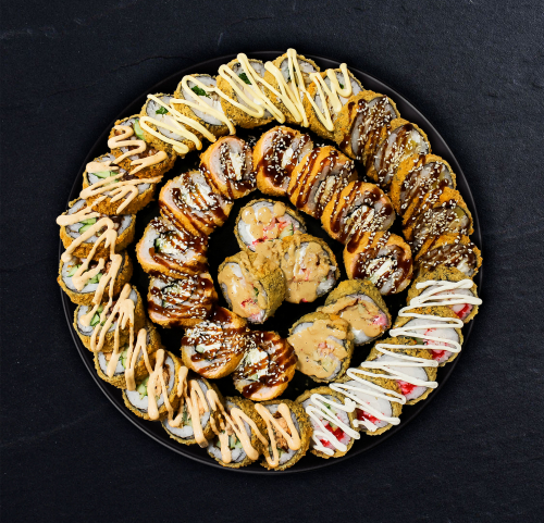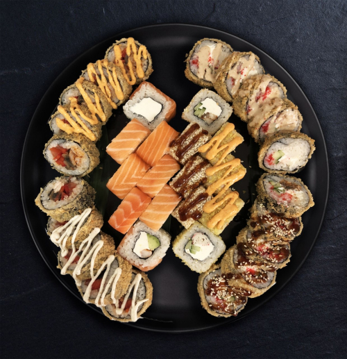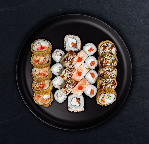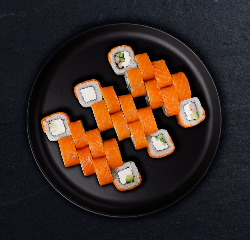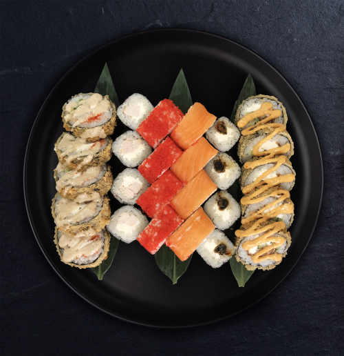 1/2 Хот флорида с креветкой, 1/2 Хот бонито чиз с жареным лососем1/2 Филадельфия классическая , 1/2 флорида с лососем1/2 ролл мидии сыр , 1/2 ролл курица сыр/26 шт.