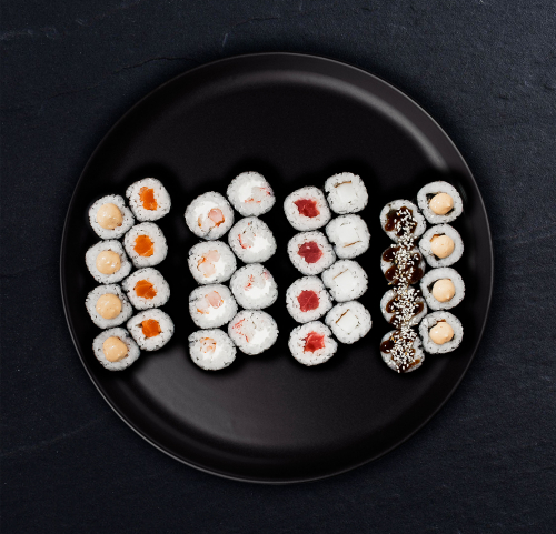 1/2 хот флорида с тунцом, 1/2 хот флорида с кальмаром1/2 филадельфия с огурцом , 1/2 филадельфия с авокадо1/2 сливочный с лососем х/к , 1/2 бонито чиз с лососем х/к1/2 ролл креветка сыр , 1/2 ролл лосось сыр/34 шт